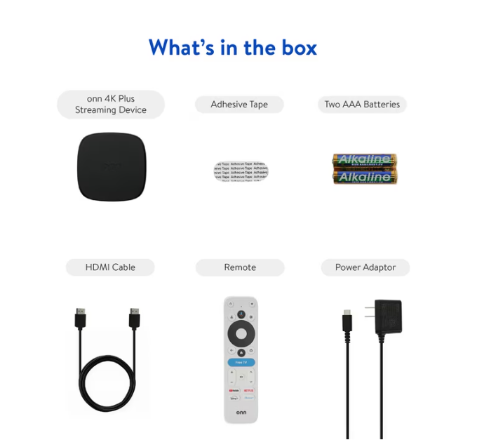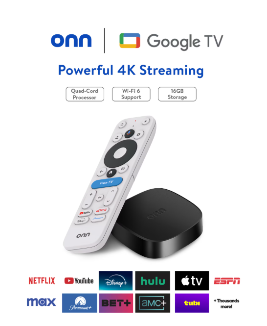 Experience fast and powerful streaming with the onn Google TV 4K Plus Streaming Device, delivering premium entertainment at an exceptional value. Easily transform your TV into a cinematic experience, showcasing your favorite entertainment in vibrant 4K Ultra HD resolution. Enjoy smooth, lag-free performance with 2GB of RAM, making navigation and multitasking a breeze. Get double the storage compared to the standard onn 4K, with 16GB of storage to provide more space to download more apps, games, and content. Stay connected with blazing-fast Wi-Fi 6 (2.4/5GHz 802.11ax) or a USB-C hub with Ethernet port connection. Immerse yourself in breathtaking visuals powered by Dolby Vision and rich, multidimensional audio thanks to Dolby Atmos technology. Effortlessly browse and discover content with Google TV, bringing all your streaming services together in one seamless and intuitive interface. Unlock a universe of over 700,000 movies and shows, plus 10,000+ apps, including Netflix, YouTube, Disney+, and a staggering 1,700+ free live TV channels. Finding what you want is a breeze with the voice remote featuring Google Assistant – simply speak to search for shows, control your TV, and get instant answers. The onn 4K Plus connects easily via HDMI and is powered by the included AC adapter. Setup is quick and easy with everything you need included in the box: the 4K Plus Streaming Device, remote (2 AAA batteries included), HDMI cable (3.28ft), AC adapter, adhesive tape, and Quick Start Guide. Subject to availability. Subscription, download, or purchase may be required for viewing. To view content in 4K, a 4K-capable TV and reliable broadband internet connection are required. Location Availability and Restrictions: onn 4K Plus Streaming Device, Google TV is only available in the United States and Puerto Rico. You will be unable to access any programs or features when set up or used internationally. Usage via VPN or location-masking services to circumvent these geographical restrictions is not supported.